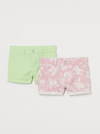 The last bunch is also in a cotton twill material but one pair is pink tie-dye and the other is a bright lime green. These have a cute little turn up at the bottom and I think Willow will love them all.