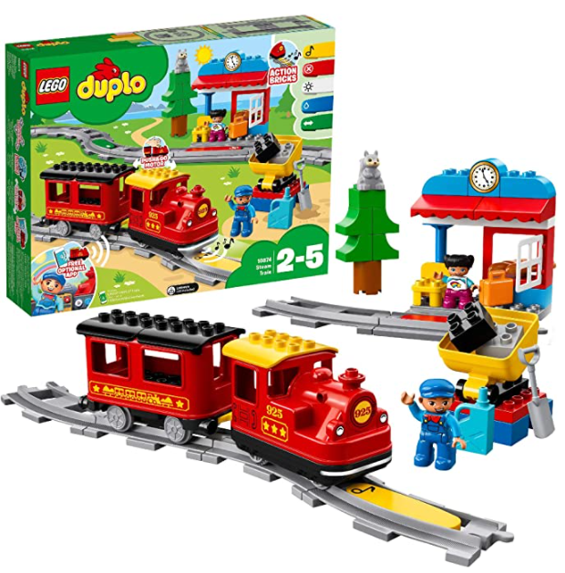 This is a push and go steam train that comes with 16 track pieces to create your own track ideas. It also comes with a train driver and child passenger as well as a squirrel and a bunch of other train-related extras. This set has lights and sounds also when you go over certain pieces of track which is a lovely little touch. It is also compatible with Duplos other train sets so you could make a huge train set by putting them all together. You can pick this up Here.